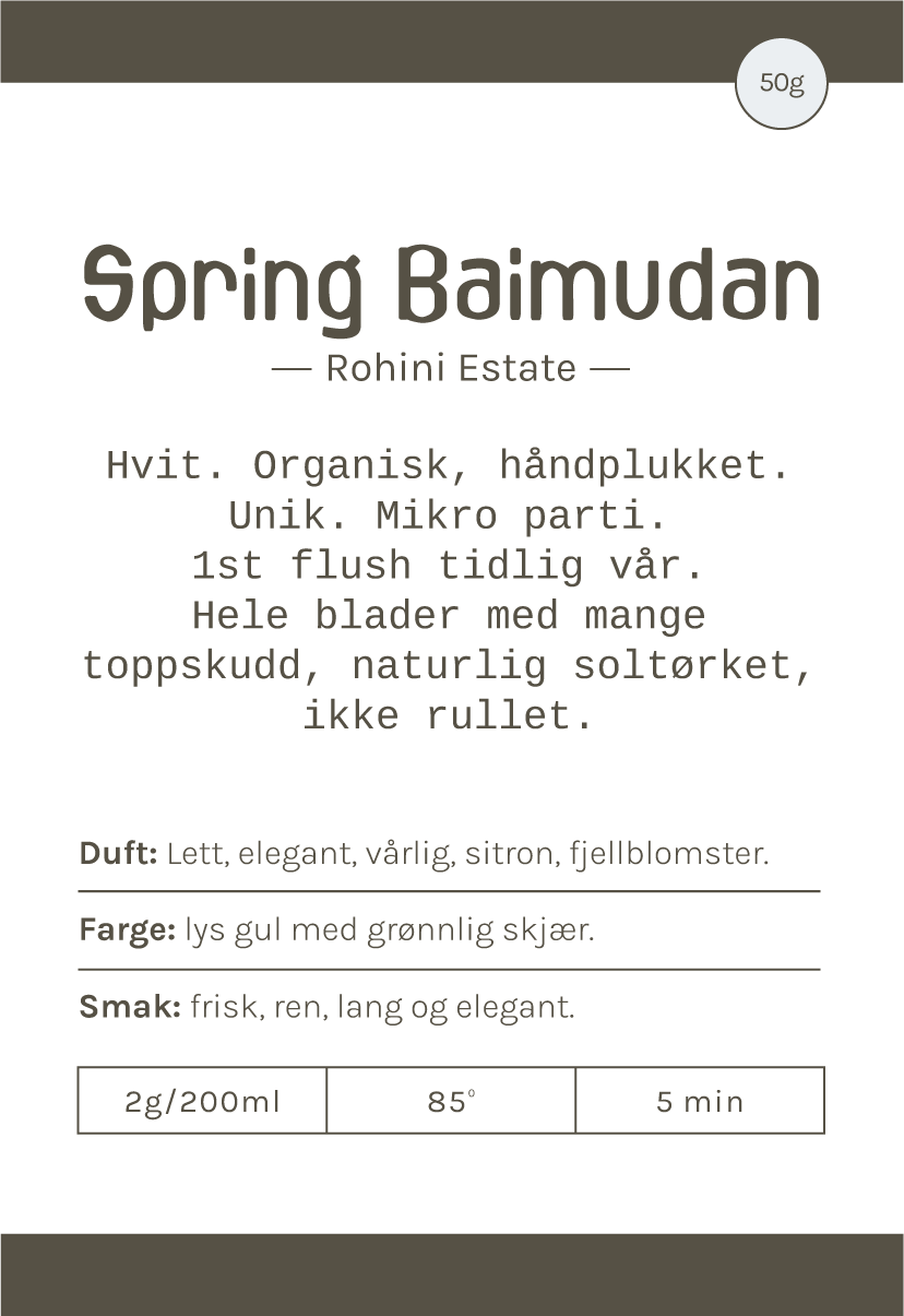 Hvit. Organisk, håndplukket. Unik. Mikroparti. 1st flush tidlig vår. Hele blader med